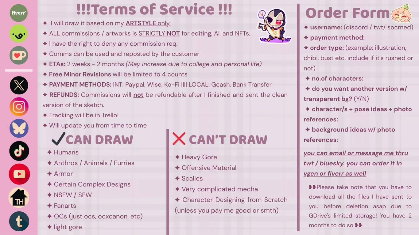 ✧ Please do exclude strong vocabularies and unnecessary long information about a character. A simple adjective of them is fine. I don't want to get overwhelmed with a lot of details + im not fluent in english HHH (im rlly sorry)--------------------------------------------------------❥❥ PAYMENTS AND REFUNDS:❥❥✧ Payment Method: TransferWise, Payoneer, Paypal, Ko-Fi, GCash and BPI